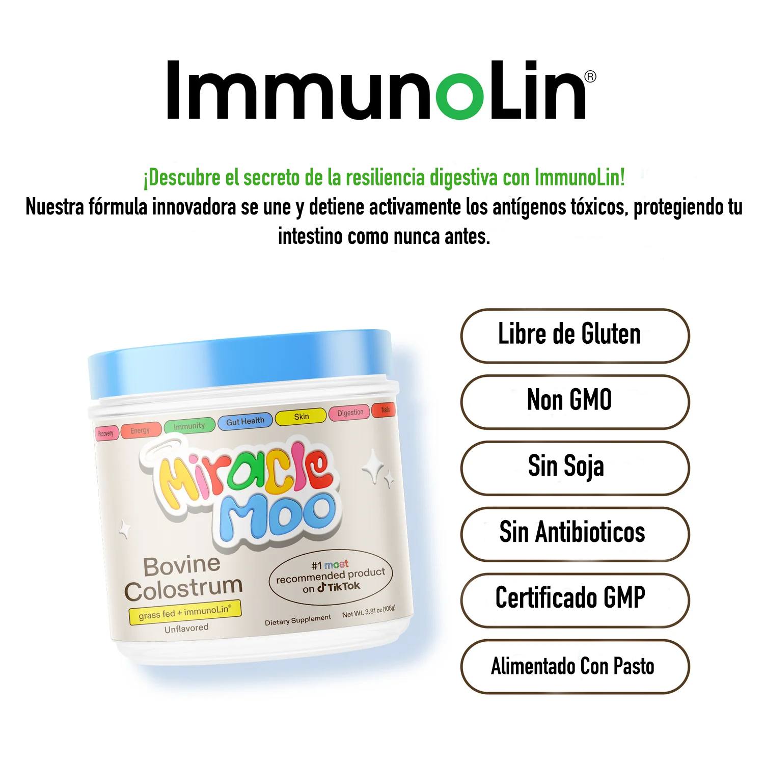 Miracle Moo es el único suplemento de calostro que contiene ImmunoLin: Un ingrediente único que apoya la defensa inmune natural del cuerpo dentro del intestino a través de la desintoxicación.